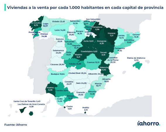 En el lado opuesto también se encuentran algunas ciudades donde la oferta de vivienda disponible es especialmente reducida en relación con su población, aunque no figuren entre las más tensionadas del país. Es el caso de ciudades como Leganés, Móstoles o Alcalá de Henares, en el área metropolitana de Madrid, donde el número de viviendas en venta por cada 1.000 habitantes se sitúa entre los más bajos del conjunto analizado. También ocurre en otros territorios como Ceuta, Melilla, Santa Cruz de Tenerife o Pamplona, donde el stock disponible en el mercado es relativamente limitado.