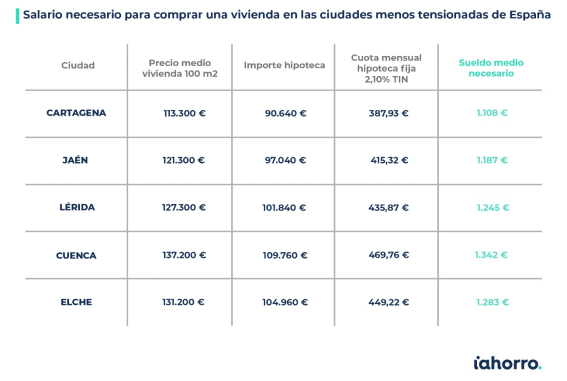 Algo por encima aparece Elche, donde adquirir una vivienda estándar valorada en unos 131.200 euros implica una cuota hipotecaria media cercana a los 449 euros mensuales y unos ingresos necesarios de aproximadamente 1.283 euros al mes. Cierra este grupo Cuenca, con un precio medio de 137.200 euros para una vivienda tipo, una cuota hipotecaria media cercana a los 470 euros y un salario necesario que ronda los 1.342 euros netos mensuales.