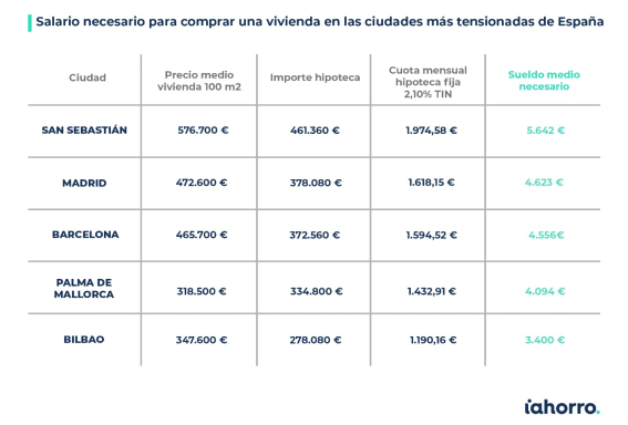 Concretamente, en este periodo, ciudades como San Sebastián han elevado su índice hasta los 97,49 puntos sobre 100, mientras Madrid y Barcelona ya superan los 80 puntos de tensión. Además, el salario necesario para adquirir una vivienda estándar de unos 100 metros cuadrados se sitúa en 5.642 euros netos mensuales en el caso de la ciudad donostiarra y se sitúa en 4.624 euros en la capital, cifras que superan ampliamente el salario medio nacional. Todo ello pese a que, según datos recopilados por el comparador hipotecario, actualmente se están firmando hipotecas en España con un tipo de interés fijo medio del 2,10% TIN, más bajo que el registrado en julio de 2025 (2,12% TIN), cuando se publicó el último Barómetro.