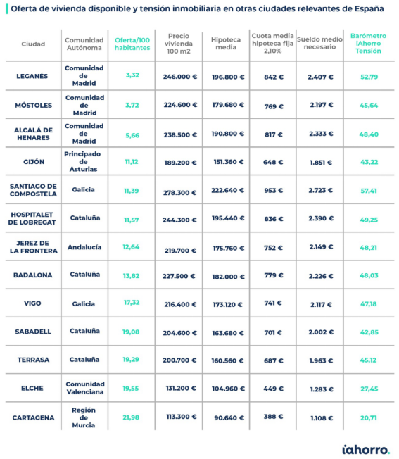 Es importante resaltar, antes de continuar con el análisis de los datos que el Barómetro de Tensión Inmobiliaria realizado por iAhorro ofrece una radiografía de un total de 65 ciudades españolas, entre las que no solo están las 50 capitales de provincia, si no que se incluyen otras por su relevancia poblacional y dinamismo económico. No obstante, las cinco primeras posiciones del ranking de tensión vuelven a estar ocupadas por grandes capitales de provincia. Este indicador, que puntúa de 0 a 100 el grado de dificultad para acceder a una vivienda en función del precio medio, el salario necesario, la cuota hipotecaria y la oferta disponible, sitúa nuevamente a los principales polos urbanos en la parte más alta de la tabla.