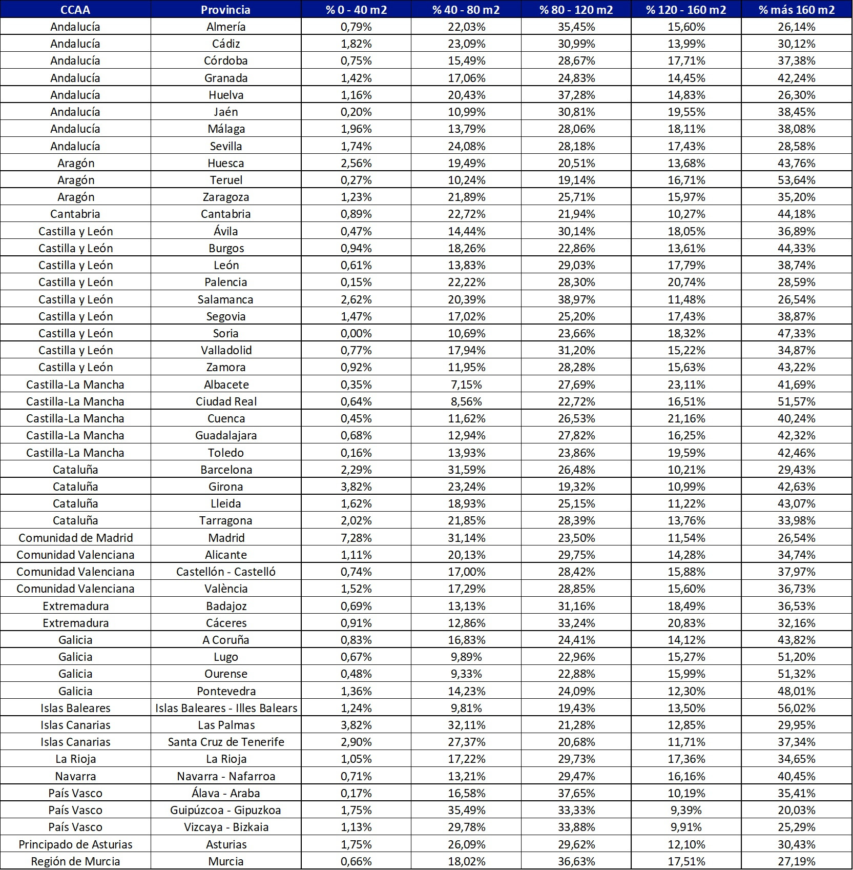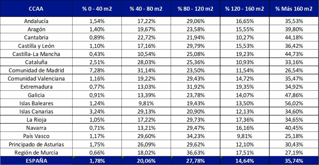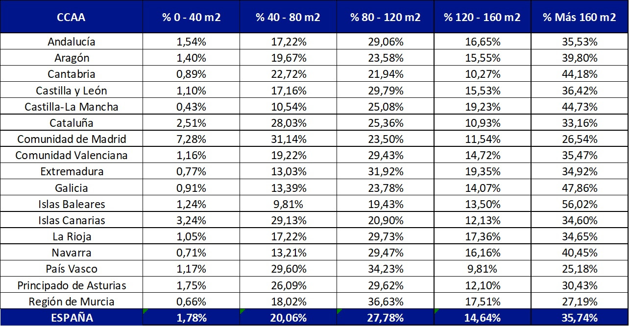 Por comunidades autónomas, Baleares lidera el ranking de las viviendas más grandes, con un 56,02% de inmuebles que superan los 160 m². Le siguen Galicia (47,86%), Castilla-La Mancha (44,73%), Cantabria (44,18%) y Navarra (40,45%), conformando el top del ranking de territorios con mayor porcentaje de viviendas amplias.