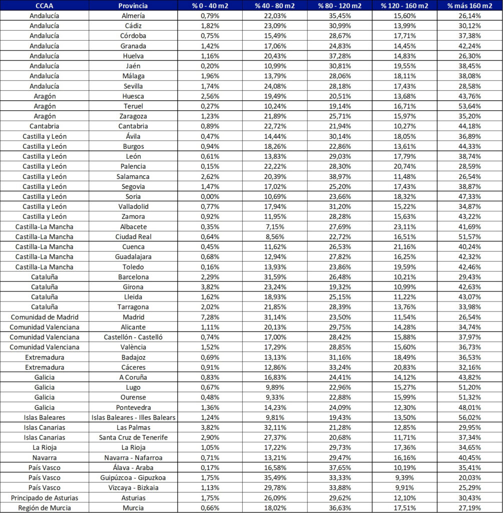 A nivel provincial, 20 territorios destacan porque más del 40% de su parque inmobiliario está compuesto por viviendas que superan los 160 m². Baleares lidera este ranking con un 56,02%, seguida de Teruel (53,64%) y Ciudad Real (51,57%).