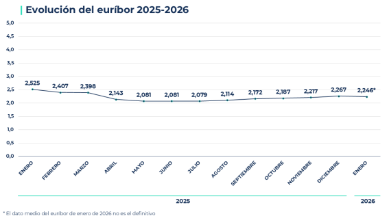 El euríbor ha iniciado 2026 con un estilo continuista, pero con un ligero giro a la baja que ofrece cierto alivio a los hipotecados. No obstante, que ahora este en caída, no supone un cambio de tendencia como tal, aunque sí rompe con una racha de cinco meses al alza. Tanto es así que, el índice de referencia más utilizado para calcular el interés de las hipotecas variables en España se sitúa este mes de enero de 2026, a falta tan solo de un dato diario, en el 2,246%. Esto significa que el indicador cae 0,021 puntos porcentuales respecto a diciembre (2,269%) y está 0,279 puntos por debajo del nivel que marcaba en enero de 2025 (2,525%).