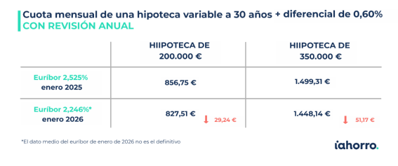 El hecho de que enero de 2026 cierre casi tres décimas por debajo del dato de hace un año tiene un impacto directo sobre las hipotecas variables con revisión anual, que son las que concentran la mayor parte de los alivios en estos momentos. Cabe señalar además que este tipo de hipotecas que se firman actualmente lo hacen con un diferencial más bajo: mientras que hace unos años el más común era del 0,99%, hoy lo habitual es situarlo en torno al 0,60%. Esto significa que, desde el inicio del contrato, el tipo de interés que se aplica al euríbor es menor, y por tanto las cuotas resultantes son más reducidas que las de hipotecas firmadas hace años.
