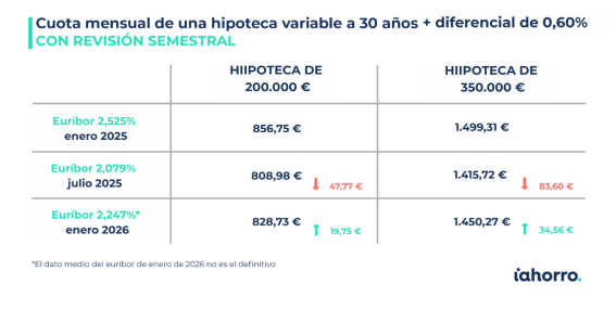 Por ejemplo, para una hipoteca de 200.000 euros con un periodo de amortización de 30 años y un diferencial del 0,60% más euríbor, la cuota mensual hace seis meses era de 808,98 euros. Con el euríbor de este mes de enero, esa misma hipoteca pasaría a abonar 828,73 euros al mes, lo que supone un incremento de casi 20 euros mensuales, o 118,49 euros en el semestre. En el caso de una hipoteca de 350.000 euros, el aumento sería mayor, acercándose a los 35 euros al mes.