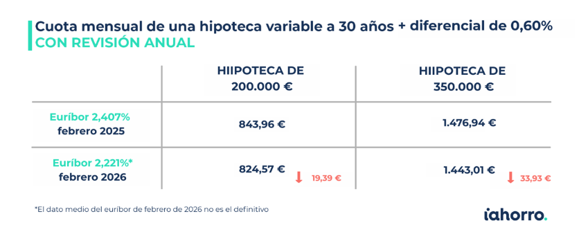 Tanto es así que, en una hipoteca variable de 200.000 euros a 30 años con un diferencial del 0,60% y revisión anual, la mensualidad pasa de los 843,96 euros que pagaba a partir de febrero de 2025 a los 824,57 euros que pagará a partir de esta revisión. Esto supone un ahorro de 19,39 euros en la cuota mensual y, en términos anuales, esta rebaja equivale a pagar 232,67 euros menos al año, un alivio moderado pero significativo en el contexto actual de ajuste del gasto familiar.
