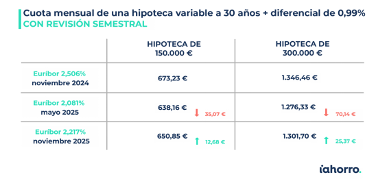 Por ejemplo, en el caso de una persona que contrató una hipoteca variable de 150.000 euros, un periodo de amortización de 30 años, un diferencial del 0,99% más euríbor hace justo un año, con esta revisión pasará de pagar una cuota mensual de 673,23 euros a abonar 649,91 euros cada mes. Esto supone una rebaja de 23,32 euros mensuales. Además, si la hipoteca contratada tuviera un importe inicial más alto, de unos 300.000 euros, el ahorro en la cuota se duplicaría: tras esta revisión pagaría 46,64 euros menos.