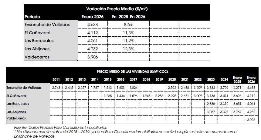 El precio medio en El Cañaveral ronda los 4.100 euros y ha tenido un crecimiento continuo en toda la serie, salvo el periodo 2020-2021, con un incremento acumulado desde 2015 del 225 %. En cuanto a Los Berrocales y Los Ahijones, presentan incrementos del 11,2 % y 12,3 % respectivamente en el último año y supera los 4.000 euros por metro cuadrado. En el caso de Valdecarros, el precio medio de las viviendas en comercialización es de 3.900 euros. No hay comparativa, dado que las primeras viviendas libres han salido recientemente al mercado.