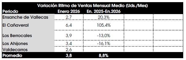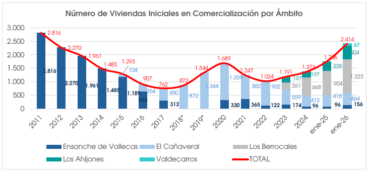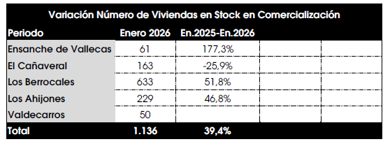 Del total de las viviendas que han salido a la venta (2.414), en este momento existen 1.136 viviendas en stock, un 39,4 % más que en enero de 2025. Los Berrocales, que inició la venta en 2023, concentra más del 50% de la oferta y Valdecarros tan solo el 4,4 % porque las primeras viviendas han salido recientemente.