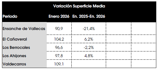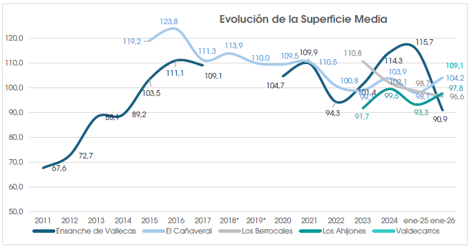 En el Cañaveral, la tendencia de la superficie media también es decreciente. Desde el comienzo de su desarrollo, la superficie media ha descendido un 12,6 %, si bien ha crecido un 6,2 % en el último año. En cuanto a la evolución de Los Berrocales, también se observa una tendencia decreciente en las superficies medias, mientras que en Los Ahijones ha crecido la superficie media en el último año un 4,8 %.