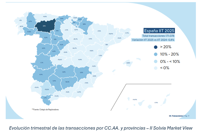 De acuerdo con el estudio, Andalucía (33.807), Cataluña (26.763), Comunidad Valenciana (26.537) y Madrid (20.255) concentraron el 63% de las compraventas del trimestre. En el otro extremo, Canarias (-11,3%), Asturias y Cataluña (-9,8%) o Baleares (-8,8%) lideraron los descensos. Aun así, el balance interanual sigue siendo positivo en todas las regiones, con incrementos destacados en La Rioja (+35,3%), Asturias (+32,1%) y Castilla y León (+30,8%).