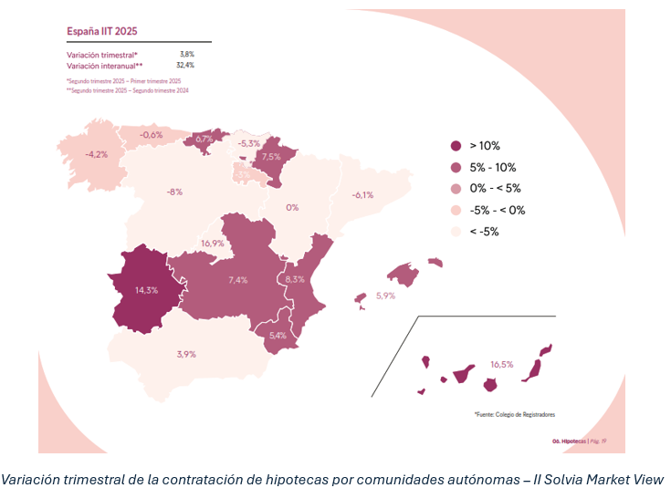 Según apunta Solvia, el tipo fijo continúa siendo la elección más habitual para suscribir una hipoteca, representando el 72,3% de las nuevas firmas, con un tipo medio del 3,02% y una duración media de 25 años. Por comunidades, Andalucía (23.422 préstamos), Cataluña (20.267) y Madrid (19.539) lideraron la actividad, con subidas notables en Navarra (+17,5%), Madrid (+16,9%) y Canarias (+16,5%).
