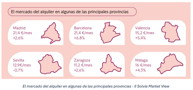 De acuerdo con el II Solvia Market View, el mercado del alquiler continúa bajo una fuerte presión. El precio medio se situó en 14,4 €/m² al mes, un 6,1% más que en el trimestre anterior y un 13,7% más interanual, situando la renta media de una vivienda de 90 m² en torno a 1.296 euros mensuales.