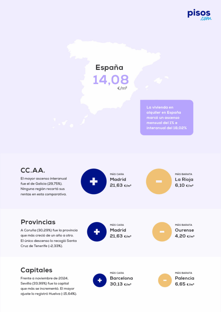 Según el informe mensual de precios de alquiler elaborado por pisos.com, la vivienda en alquiler en España tuvo en noviembre de 2025 un precio medio por metro cuadrado de 14,08 euros. Esta cifra arrojó una subida mensual del 1%. En la comparativa interanual, creció un 18,02%.