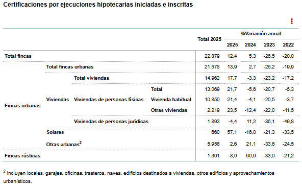 El número total de inscripciones de certificaciones por ejecuciones hipotecarias iniciadas en el año 2025 fue de 22.879, lo que supuso un 12,4% más que en 2024.