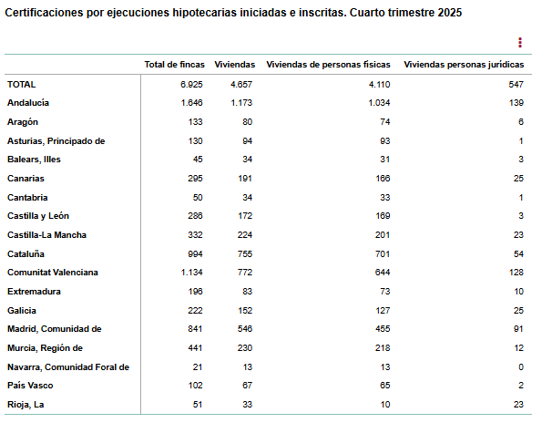 De las 13.069 viviendas de personas físicas con ejecución hipotecaria, 10.850 fueron habituales en propiedad (un 21,4% más que en 2024). Por su parte, 2.219 no eran residencia habitual de los propietarios (un 23,5% más).