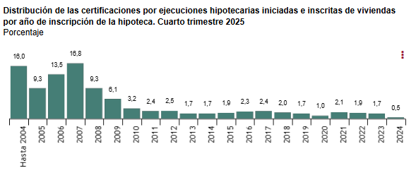 El 15,6% de las ejecuciones hipotecarias iniciadas sobre viviendas en el año 2025 correspondió a hipotecas constituidas en el año 2007, el 13,8% a hipotecas constituidas en 2006 y el 10,1% a hipotecas de 2005.