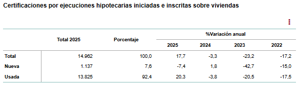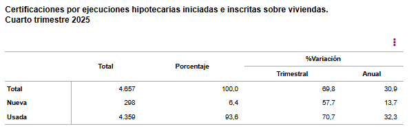 El 7,6% de las ejecuciones hipotecarias sobre viviendas en el año 2025 fueron sobre viviendas nuevas y el 92,4% sobre viviendas usadas.
