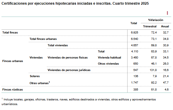 El número de inscripciones de certificaciones por ejecuciones hipotecarias iniciadas en los registros de la propiedad en el cuarto trimestre de 2025 fue de 6.925, lo que supuso un incremento del 32,7% respecto al mismo periodo del año anterior.