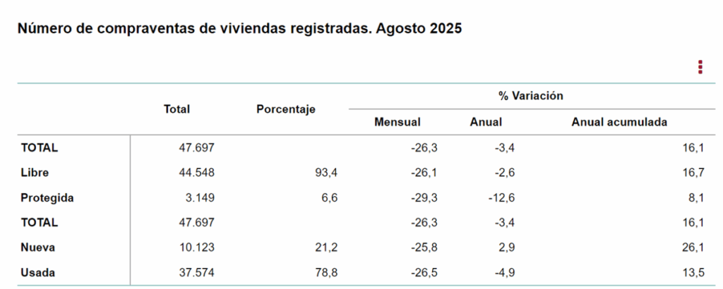 Nuevo informe estadístico en materia de vivienda ofrecido por el Instituto Nacional de Estadística (INE). El organismo oficial arroja luz sobre el mercado y aporta datos nacionales sobre la evolución del número de compraventas de viviendas registradas durante el mes de agosto.