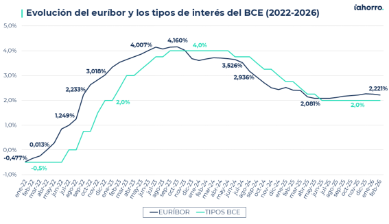 Ya en 2024, pese a que la guerra continuaba, el BCE empezó a moderar los tipos hasta situarlos en el entorno del 2%, y el euríbor descendió progresivamente hasta niveles cercanos al 2,2%. La relación es clara: cuando el BCE endurece su política monetaria, el euríbor reacciona casi de inmediato, y eso termina reflejándose en la cuota mensual que pagan millones de hogares.