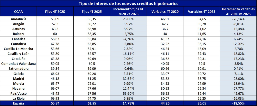 El portal inmobiliario pisos.com ha analizado la evolución del tipo de interés de los nuevos créditos hipotecarios en España entre el cuarto trimestre de 2020 y el mismo periodo de 2025 a partir de los datos publicados por el Colegio de Registradores de la Propiedad y Mercantiles. El análisis pone de manifiesto una transformación estructural en las preferencias de los compradores de vivienda españoles: la hipoteca a tipo fijo ha pasado de ser una opción minoritaria en algunas regiones a convertirse en la modalidad predominante en prácticamente todo el territorio nacional.