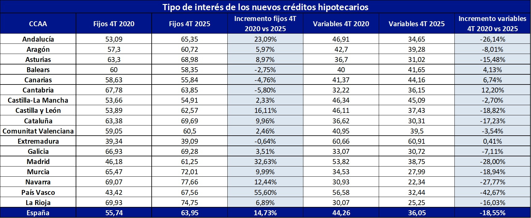 El País Vasco protagoniza el mayor salto en el peso de la hipoteca fija: en el cuarto trimestre de 2020 apenas representaba el 43,42% de las nuevas operaciones, y en el mismo período de 2025 ha ascendido hasta el 67,56%, un incremento del 55,60%. Le sigue Madrid, con un avance del 32,63% (del 46,18% al 61,25%), y Andalucía, con un crecimiento del 23,09% (del 53,09% al 65,35%).