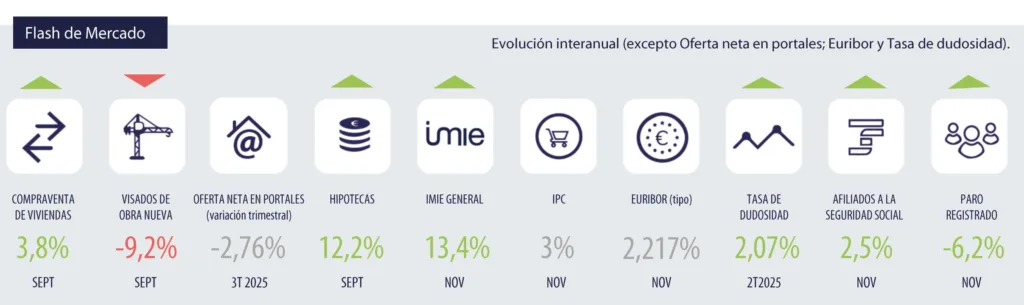 La vivienda terminada (nueva y usada) sigue acelerando de forma intensa el crecimiento de los precios por encima de la inflación, impulsada por la alta demanda en un entorno de escasez de oferta. En noviembre, el Índice General registró un aumento del 1,3 % respecto al mes anterior y del 13,4 % en el último año, lo que supone un crecimiento de +10,1 % por encima de la inflación. Las ‘Áreas metropolitanas’ destacan como el mercado más dinámico en tasa mensual (+1,8 %) y las islas se mantienen como el grupo con mayor revalorización en el último año (+16,8 %).