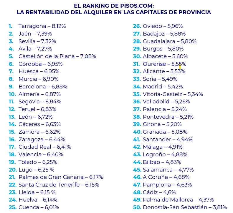 El ranking de pisos.com sobre la rentabilidad media del alquiler de las capitales de provincia españolas dibujó una horquilla que va desde una rentabilidad del 8,12% registrada en Tarragona al 3,81% de Donostia – San Sebastián. En este sentido, los precios más competitivos se encontraron en la ya citada Tarragona (8,12%), Jaén (7,39%), Sevilla (7,32%), Ávila (7,27%), Castellón de la Plana (7,08%), Córdoba (6,95%), Huesca (6,95%), Murcia (6,90%), Barcelona (6,88%) y Almería (6,87%). En el ranking de rentabilidad de las capitales de provincia menos beneficiosas fueron Donostia – San Sebastián (3,81%), Palma (4,37%), Cádiz (4,6%), Pamplona (4,63%), A Coruña (4,68%), Salamanca (4,77%), Bilbao (4,83%), Logroño (4,88%), Málaga (4,91%) y Santander (4,94%). Tanto Madrid como Barcelona consolidan una evolución positiva en el mercado inmobiliario. Barcelona destaca con un notable incremento de su rentabilidad, que pasa del 5,88% en septiembre al 6,88% en octubre, mientras que Madrid también registra una subida, aunque más moderada, avanzando del 5,31% al 5,42%. Este comportamiento al alza en ambas capitales confirma su solidez como mercados de referencia y refuerza su posición como destinos prioritarios para la inversión inmobiliaria”,afirma el experto.