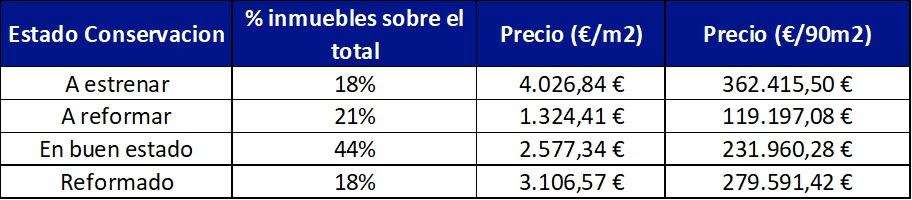 Las viviendas reformadas se sitúan en segundo lugar con 279.591 euros de media, seguidas por las que están en buen estado (231.960 euros). El segmento más económico corresponde a las viviendas a reformar, con un precio medio de 119.197 euros, lo que representa menos de un tercio del valor de los inmuebles a estrenar.