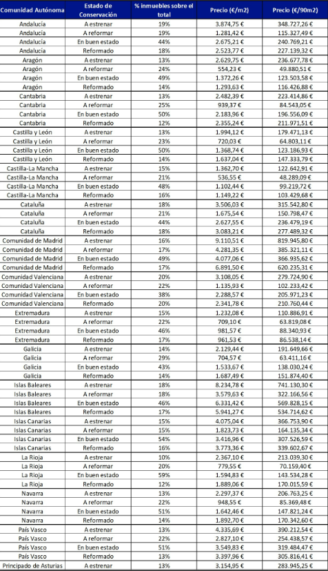 En cuanto a las viviendas que requieren reforma, Galicia lidera con un 29% de su oferta en esta categoría, seguida de Cantabria (25%), Aragón y Asturias (ambas con un 24%) y Castilla y León (23%). Las comunidades con menor porcentaje de viviendas a reformar son Canarias (15%), Madrid (17%), Baleares (18%) y Andalucía (19%).