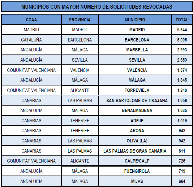 Municipios y CCAA con más solicitudes revocadas