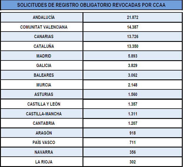 En el ámbito autonómico, y en línea con los datos anteriormente expuestos, Andalucía es, con mucha diferencia, la comunidad autónoma con mayor número de solicitudes de registro obligatorio revocadas (21.872). A continuación, Comunitat Valenciana (14.387) y Canarias (13.726) se sitúan asimismo en la parte alta de la tabla en números registros denegados.